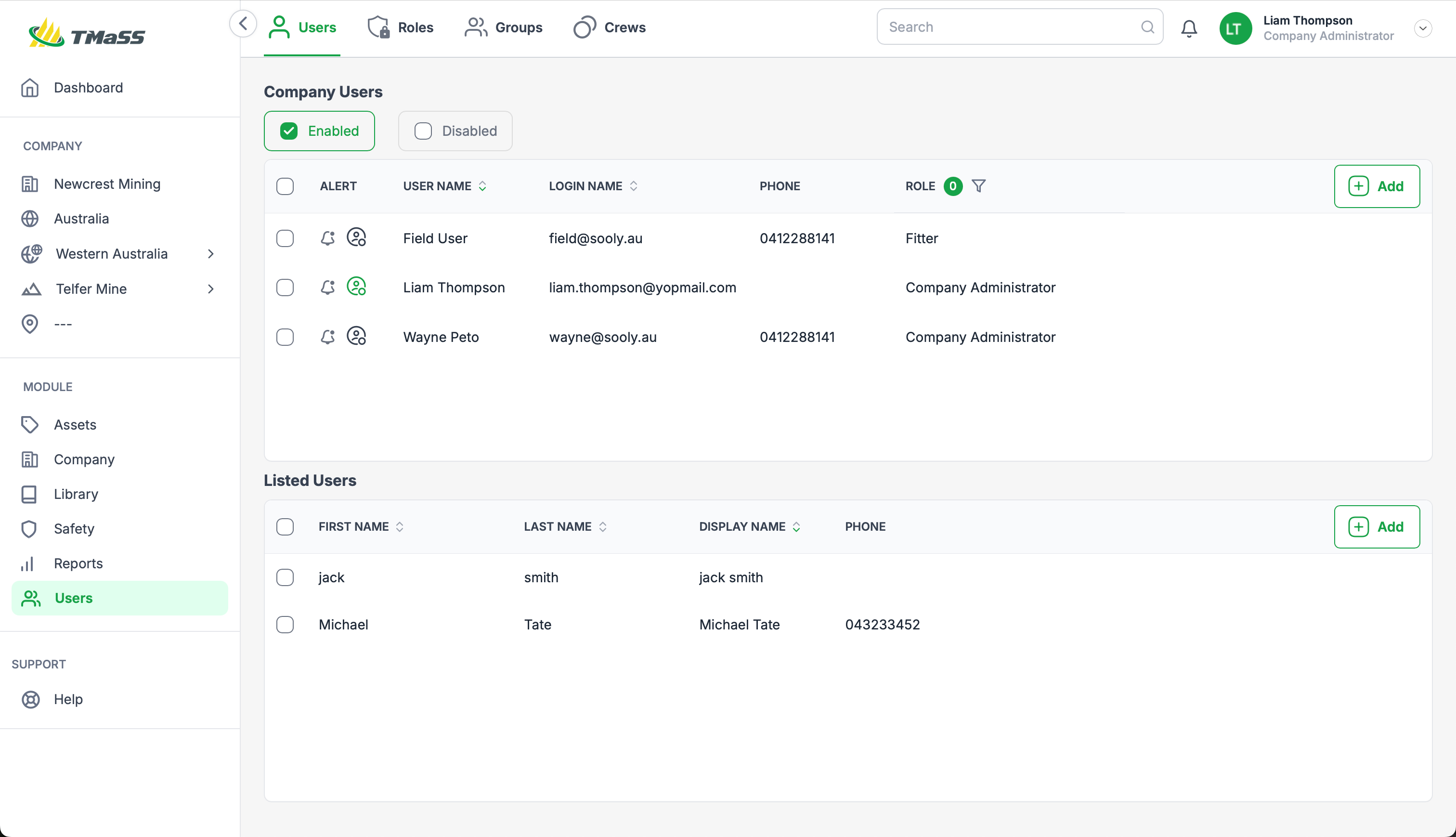 Crews are a new addition to TMaSS. Crews are a group of users that has its own login credentials. Crews are targeted to teams whereby a group of users have only a single computer and function audition is required. When a function is completed the crew will be associated with that function allowing for future followup if required. A crew requires a single named user to be assigned as the crew leader. A crew utilises 1 user license.