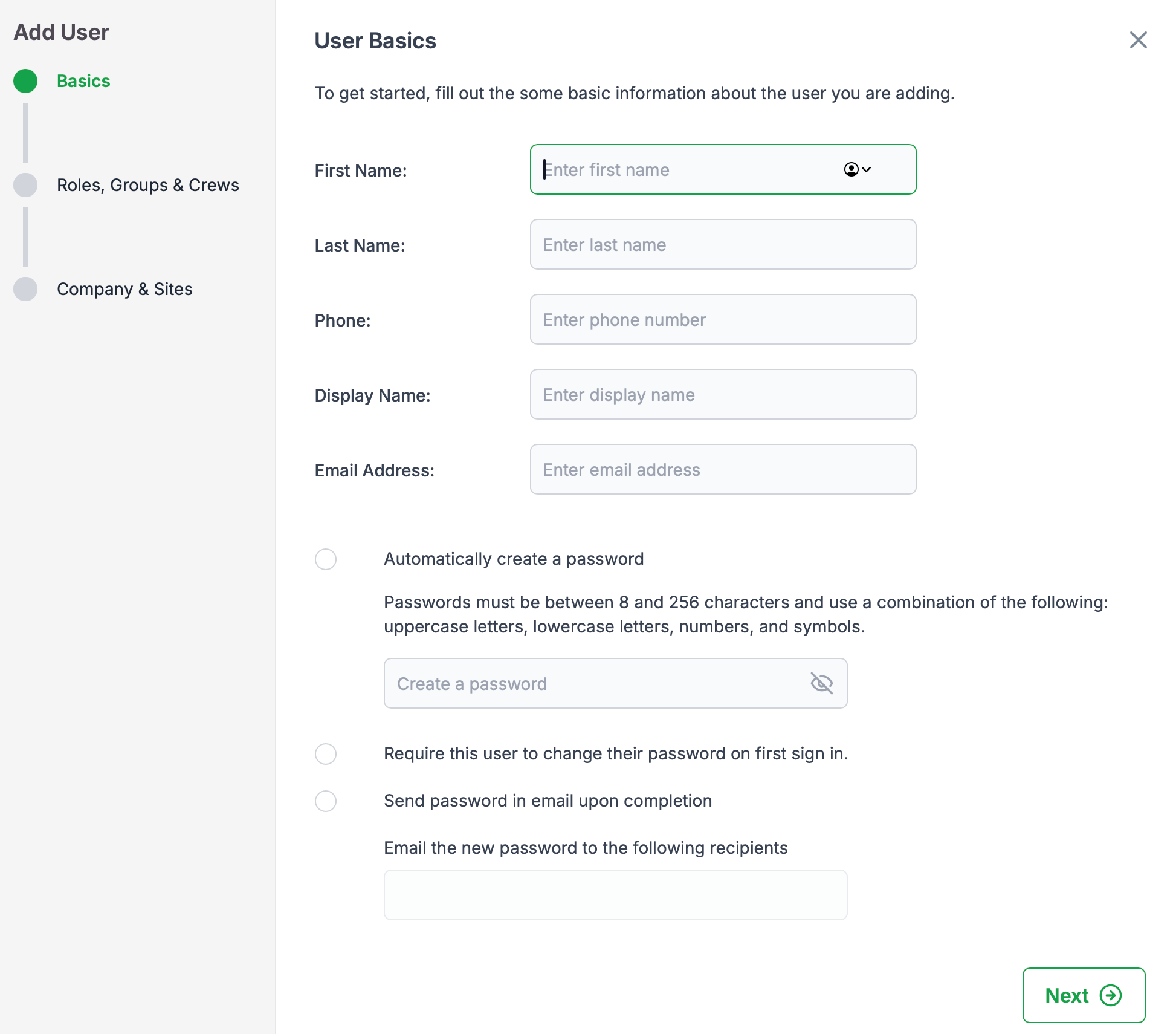 Roles, Groups & Crews: Select a single or multiple roles, group and or crew. You must select a minimum of 1 role, or 1 group to continue. Selections made here will determine the users privileges.