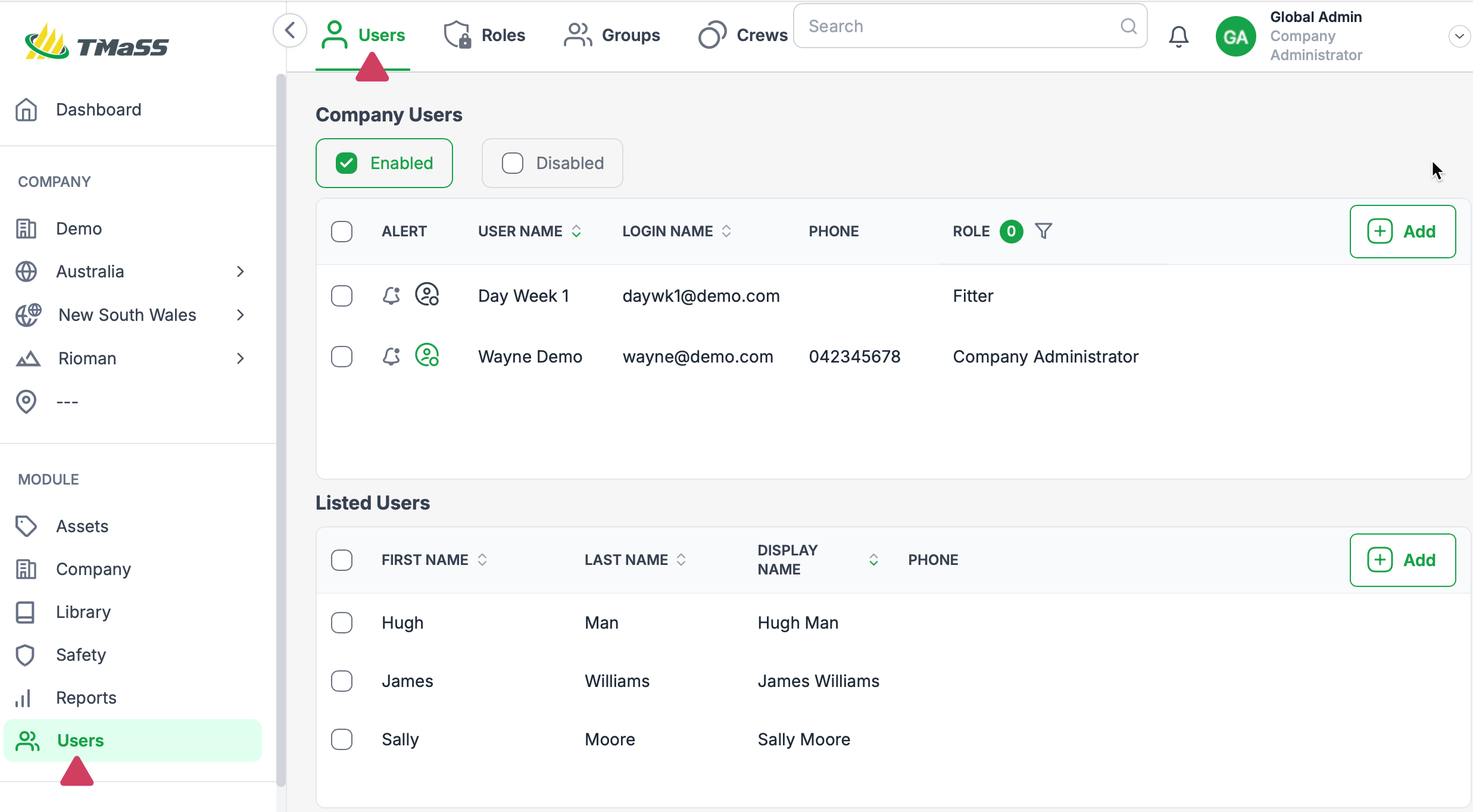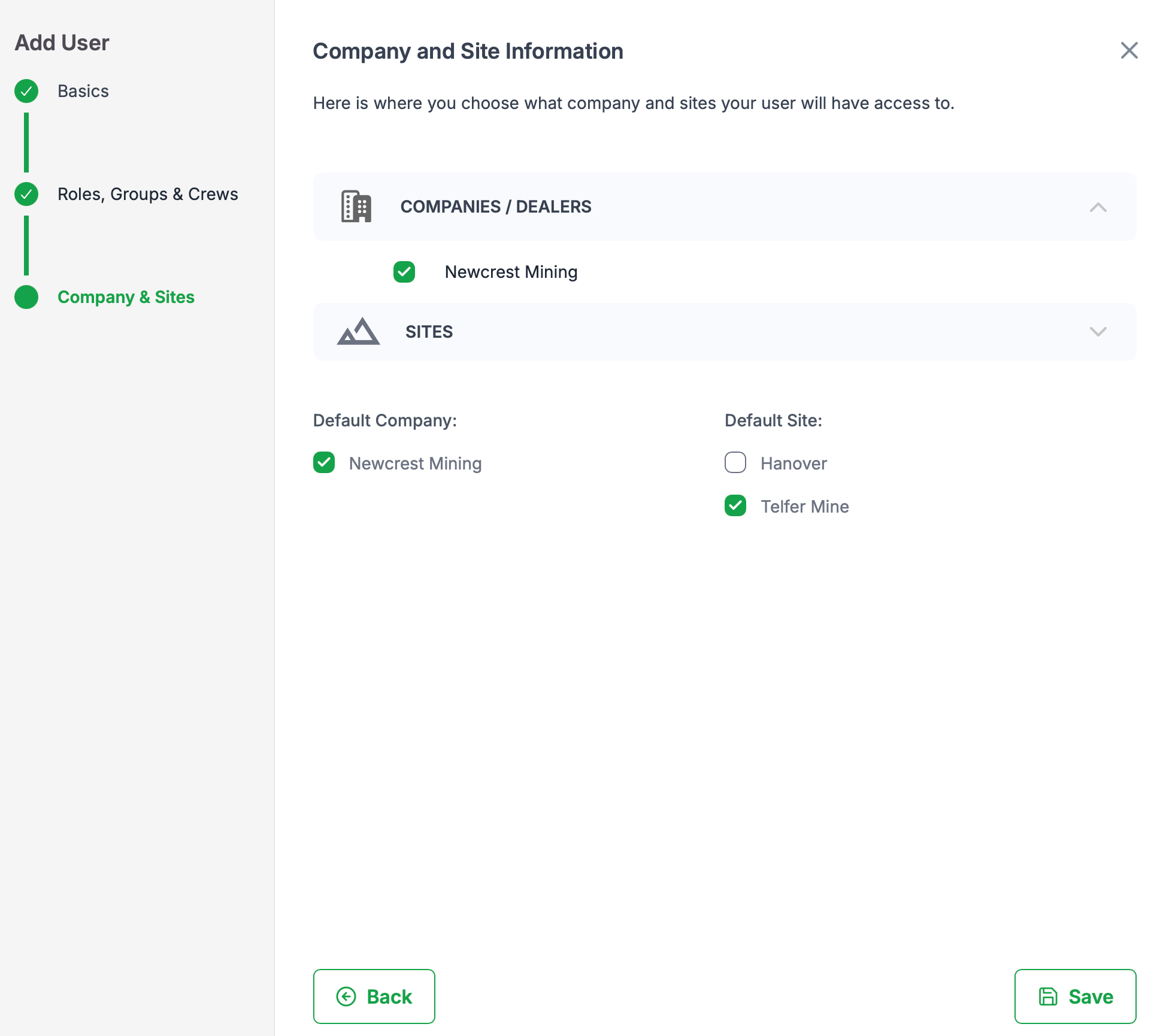 Company & Sites: Select the company and sites the user will have access to. In the event that a user has access to multiple companies and sites, by selecting a default company and site, on login the user will be navigated to these defaults. What you see here will be determined by multiple factors, these are: