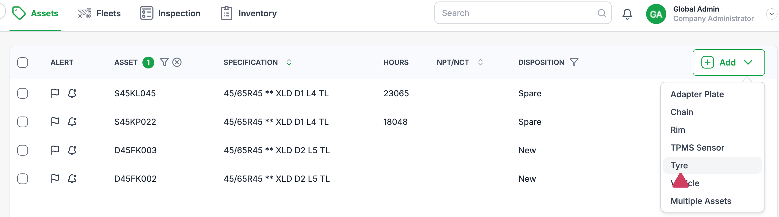 To add a tyre, click the add button. From the dropdown menu, click 'Tyre'