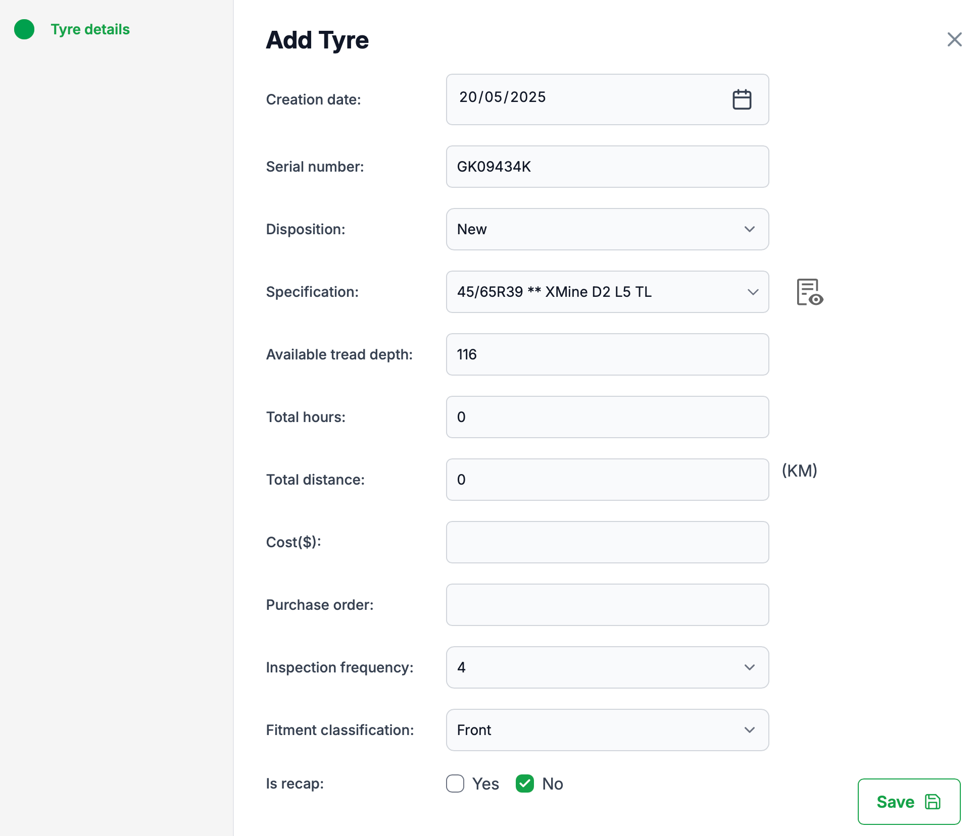 On the 'Add Tyre' dialogue, enter the tyre details.