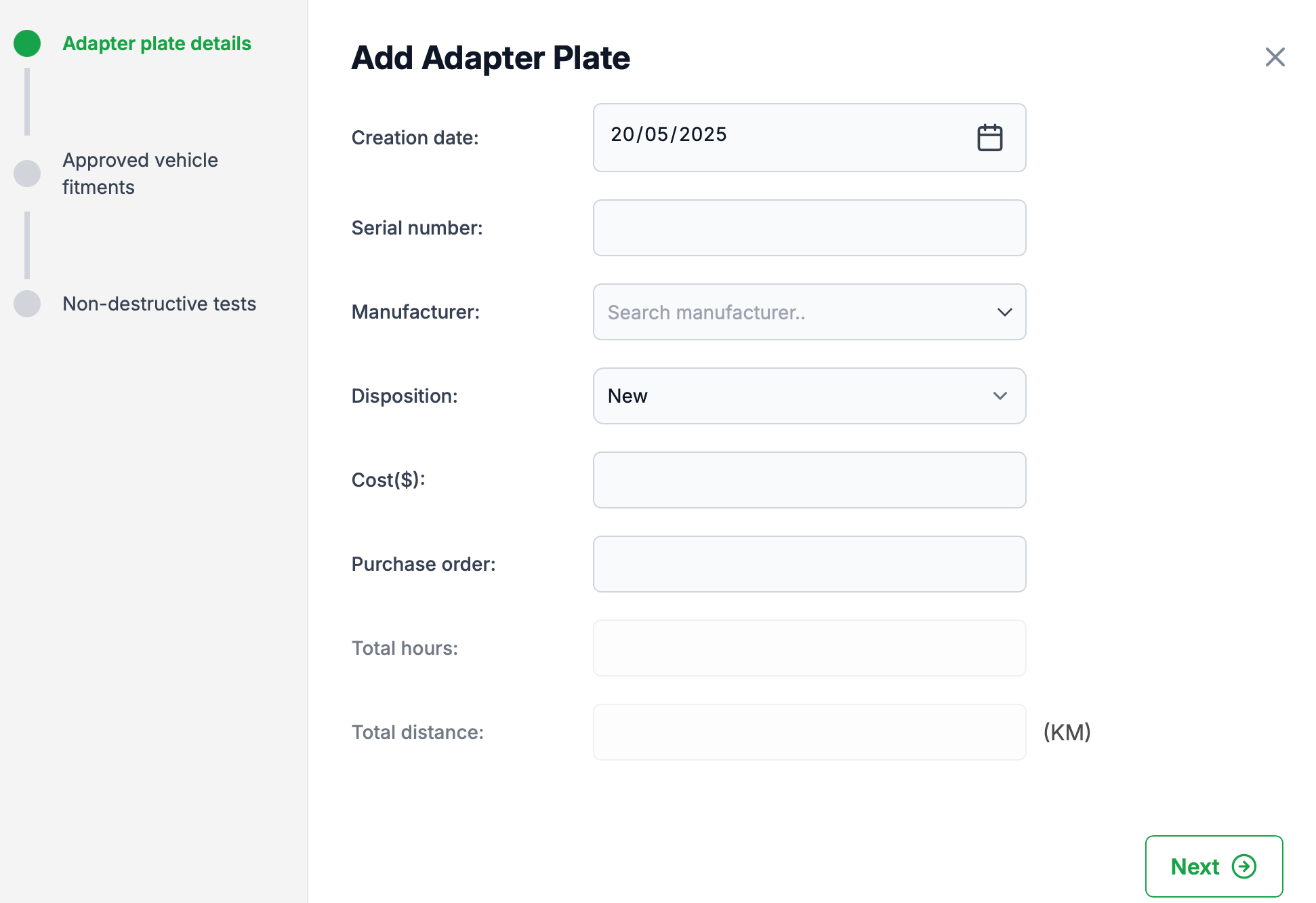 On the 'Add Adapter Plate' dialogue, enter the Adapter plate details and click 'Next' to continue..