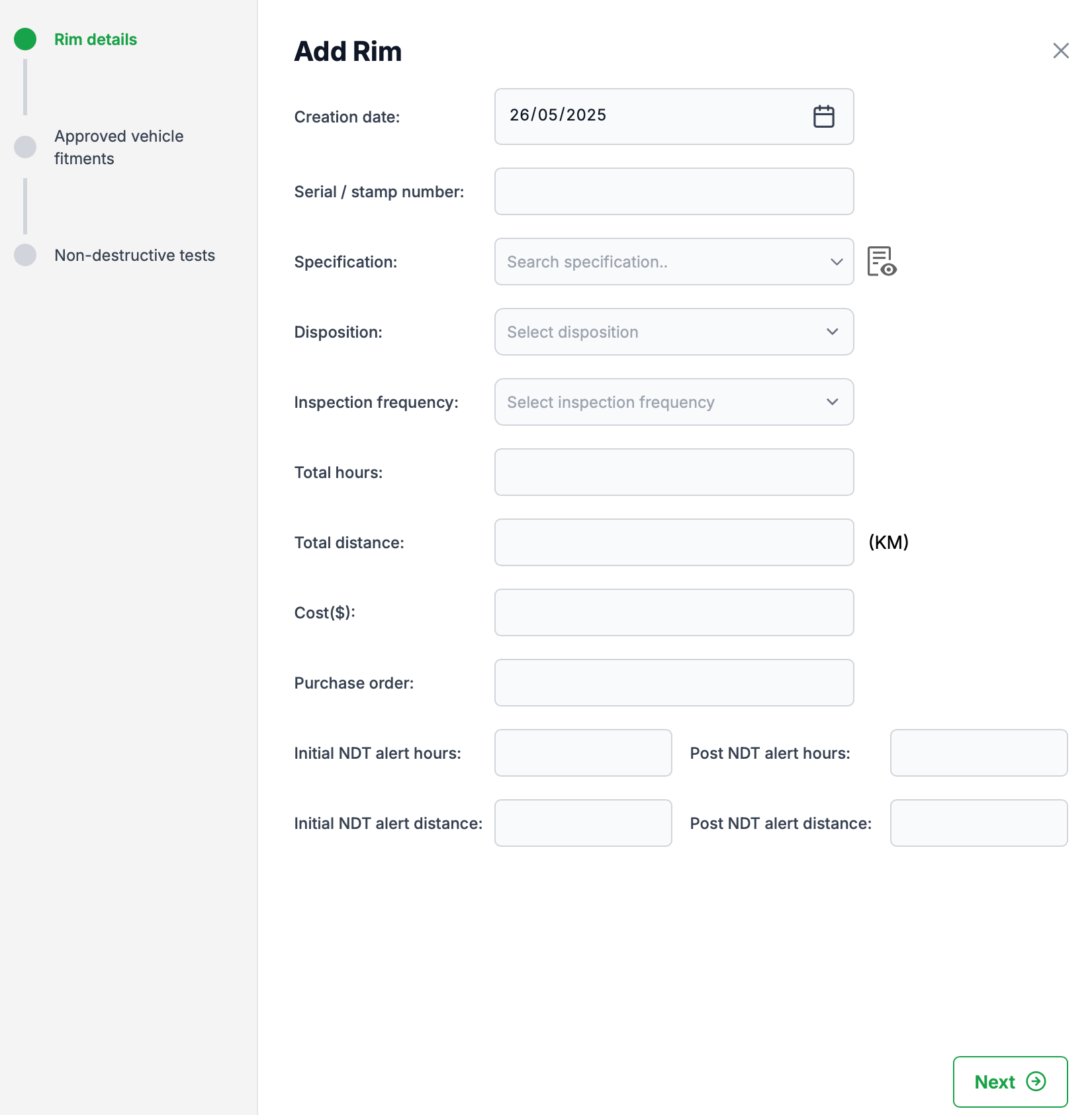 On the 'Add Rim' dialogue, enter the Rim details and click 'Next' to continue..