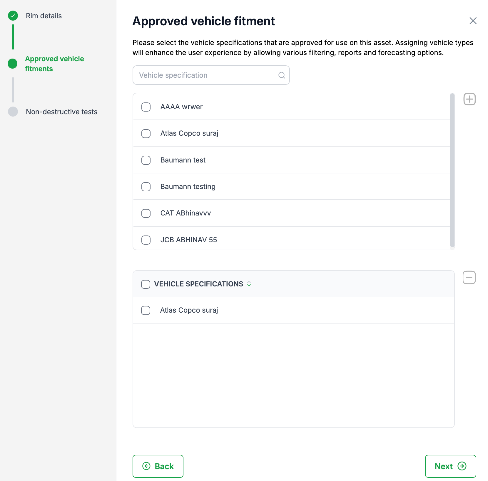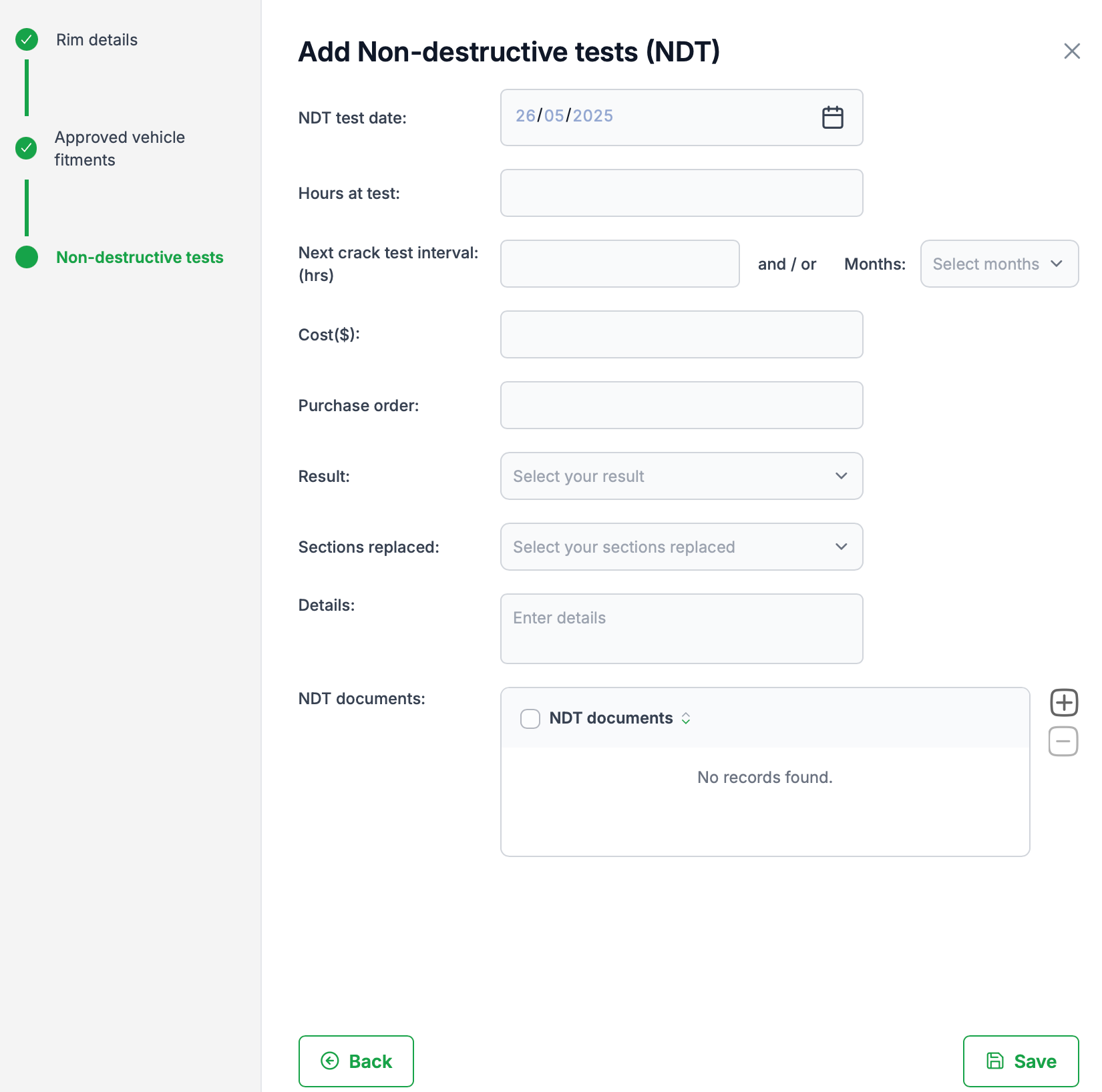 This dialogue allows you to add any existing non destructive tests. If you don't have any tests to enter click save to save the new rim asset.
