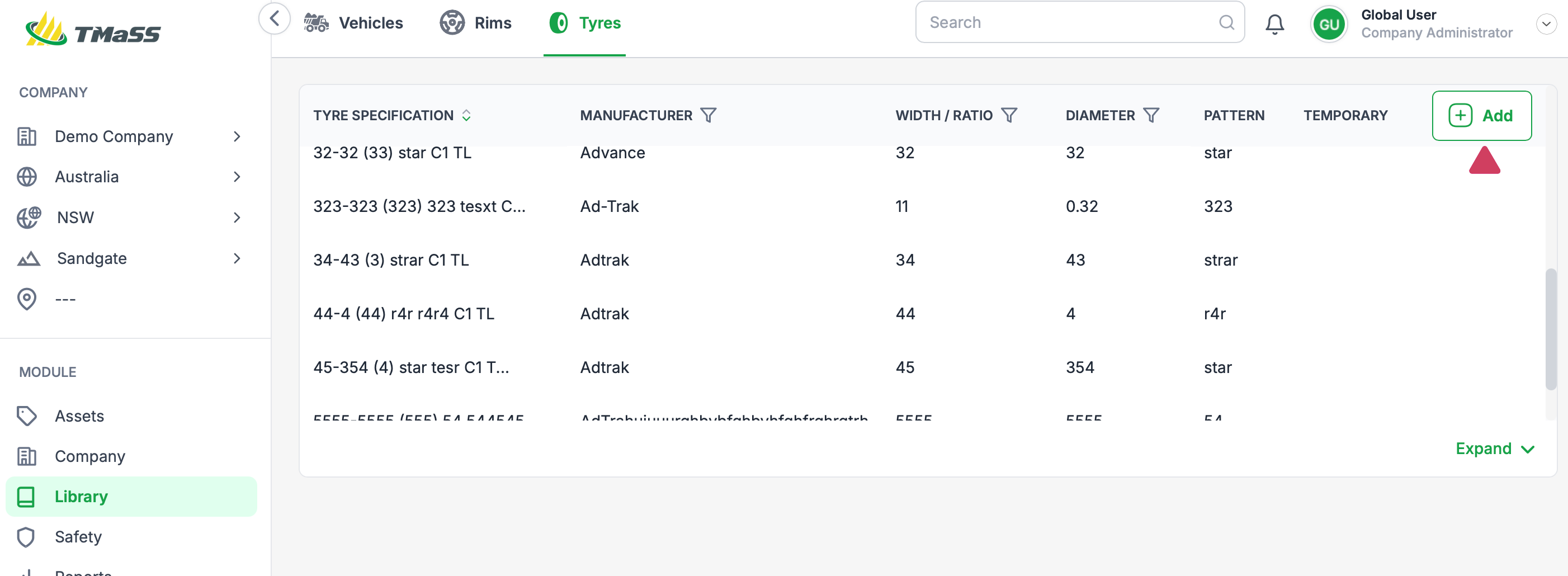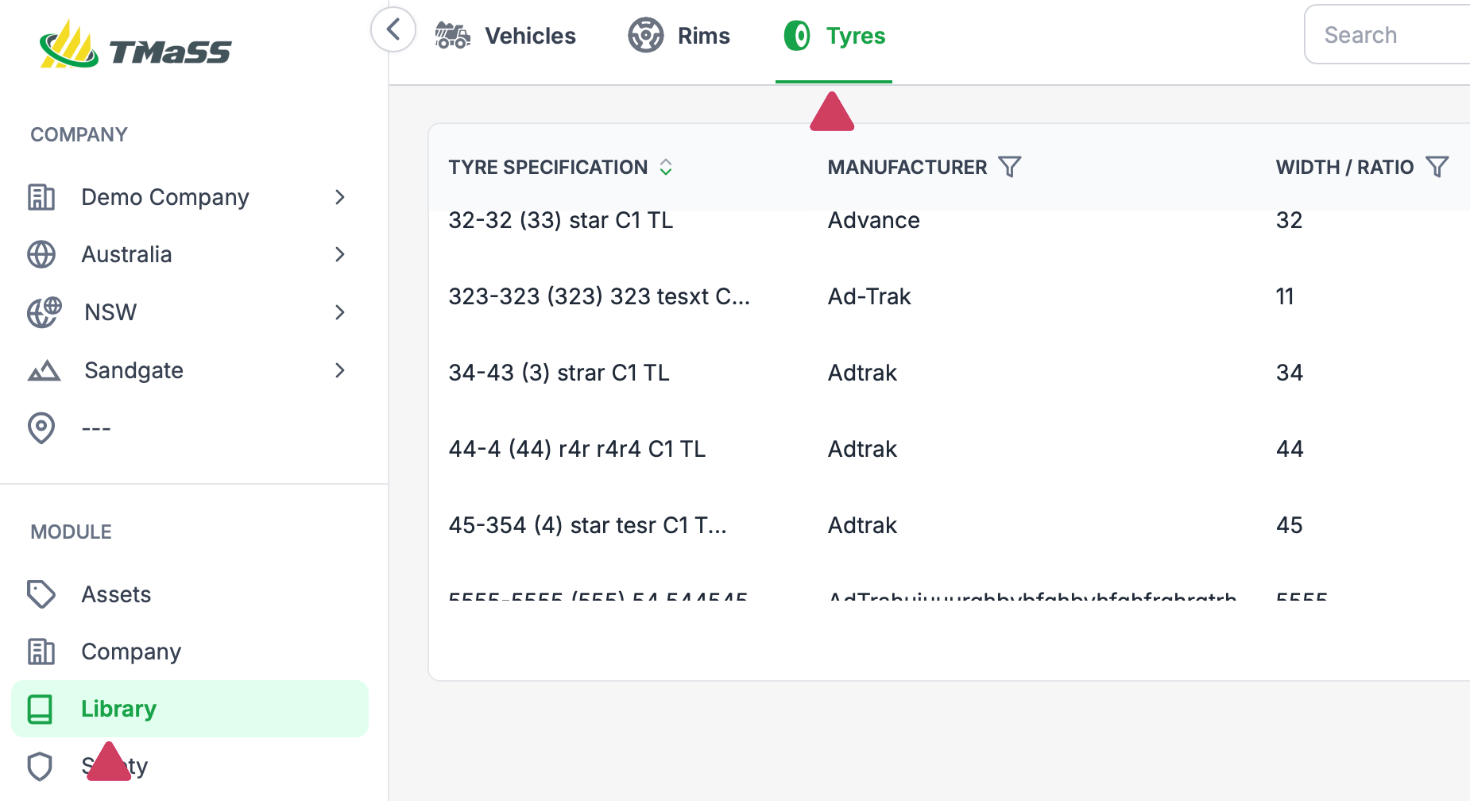 - STEP 1: Navigate to the Library module, and Tyres sub-module.