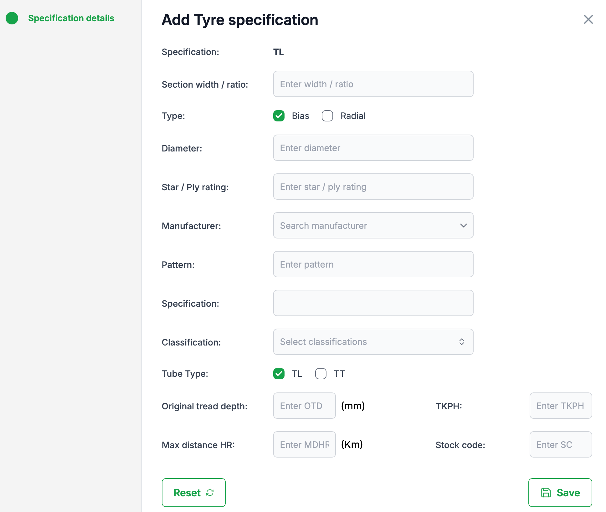 The 'Add tyre specification' dialogue will open. The following fields are mandatory: