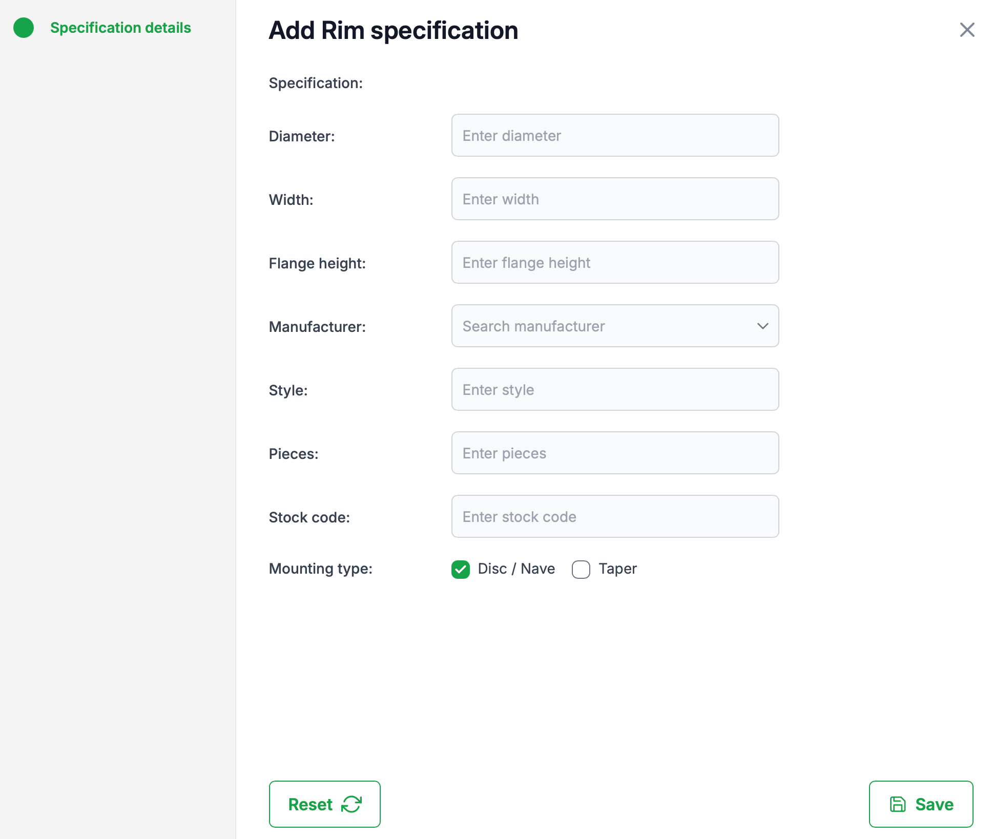The 'Add rim specification' dialogue will open. The following fields are mandatory:
