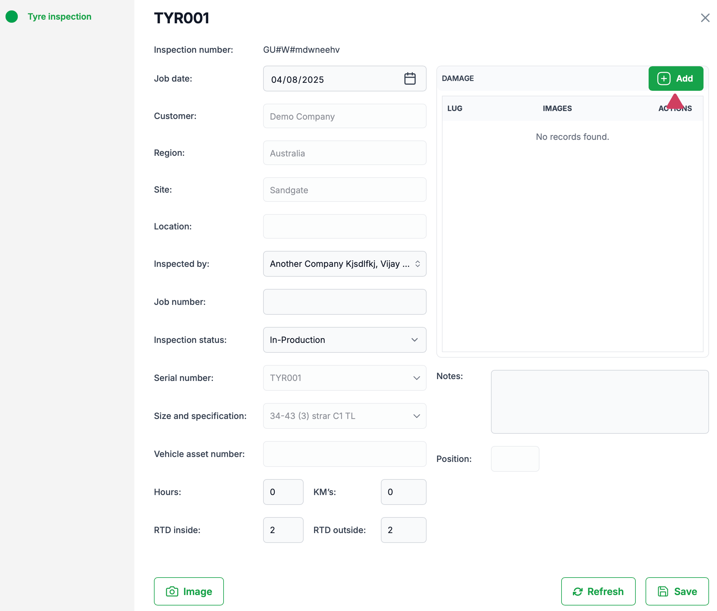 You can add an inspection on a tyre regardless if it is attached to a vehicle or not. When adding an inspection, there user can update the tyres hours, tread depths, inspection status, add damage and photos.