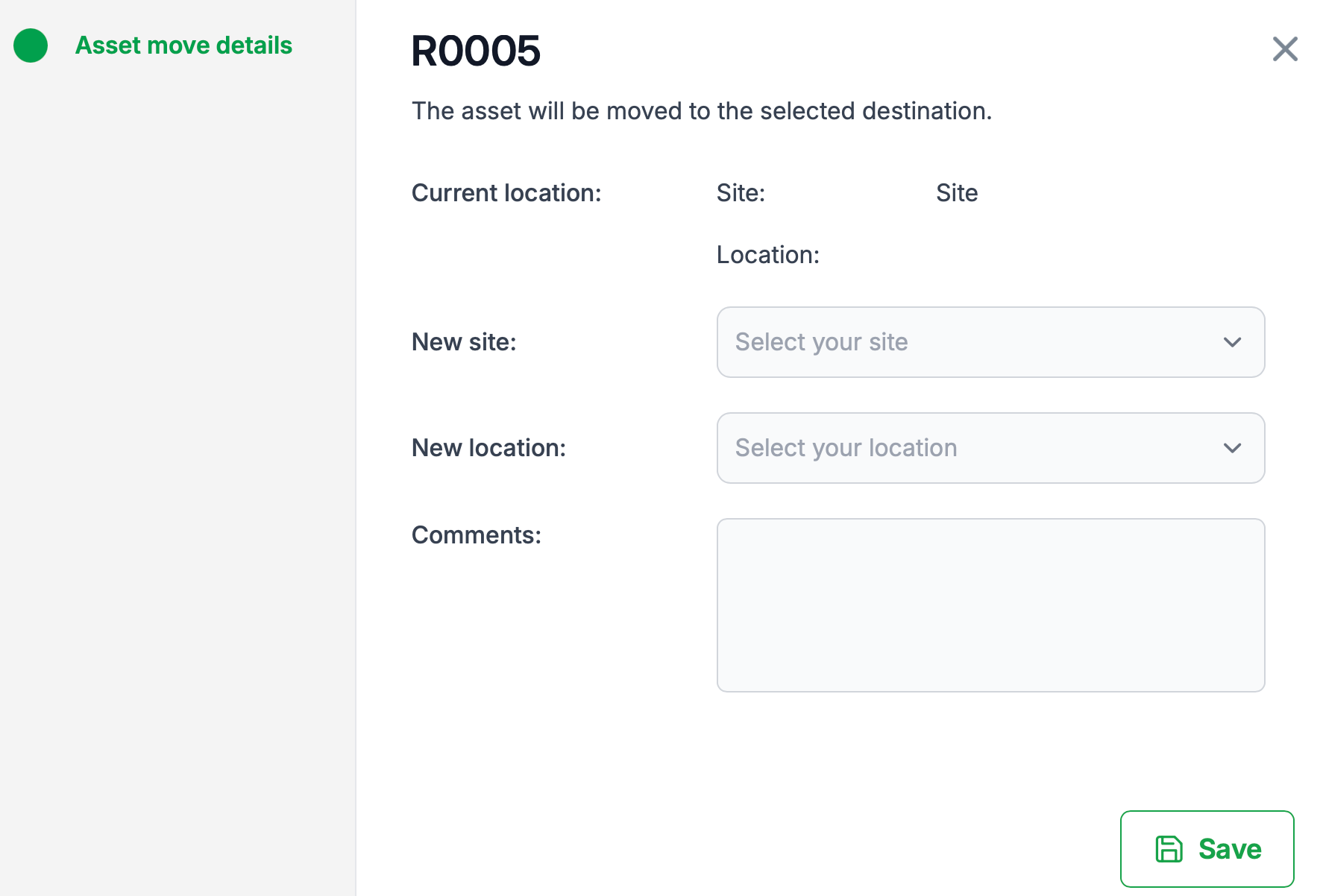 You can verify the move by checking the asset’s updated site and location fields.