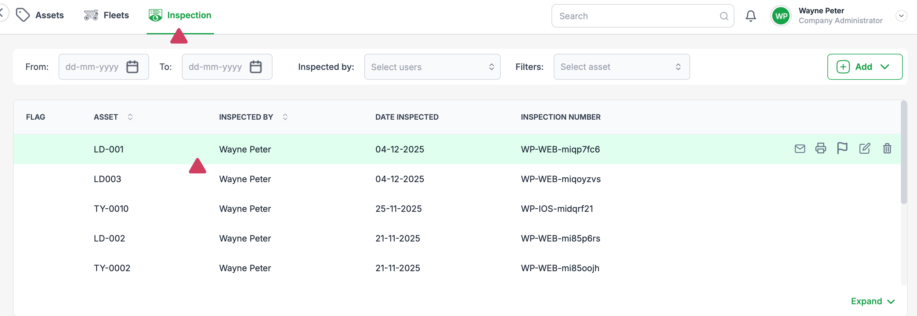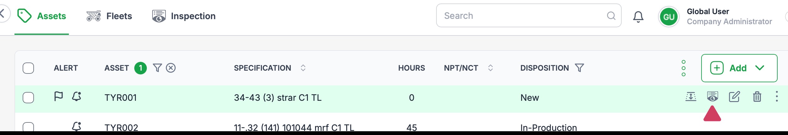 To add an inspection, navigate to the Assets module, find the desired tyre asset and click the inspection icon as highlighted in the image below.