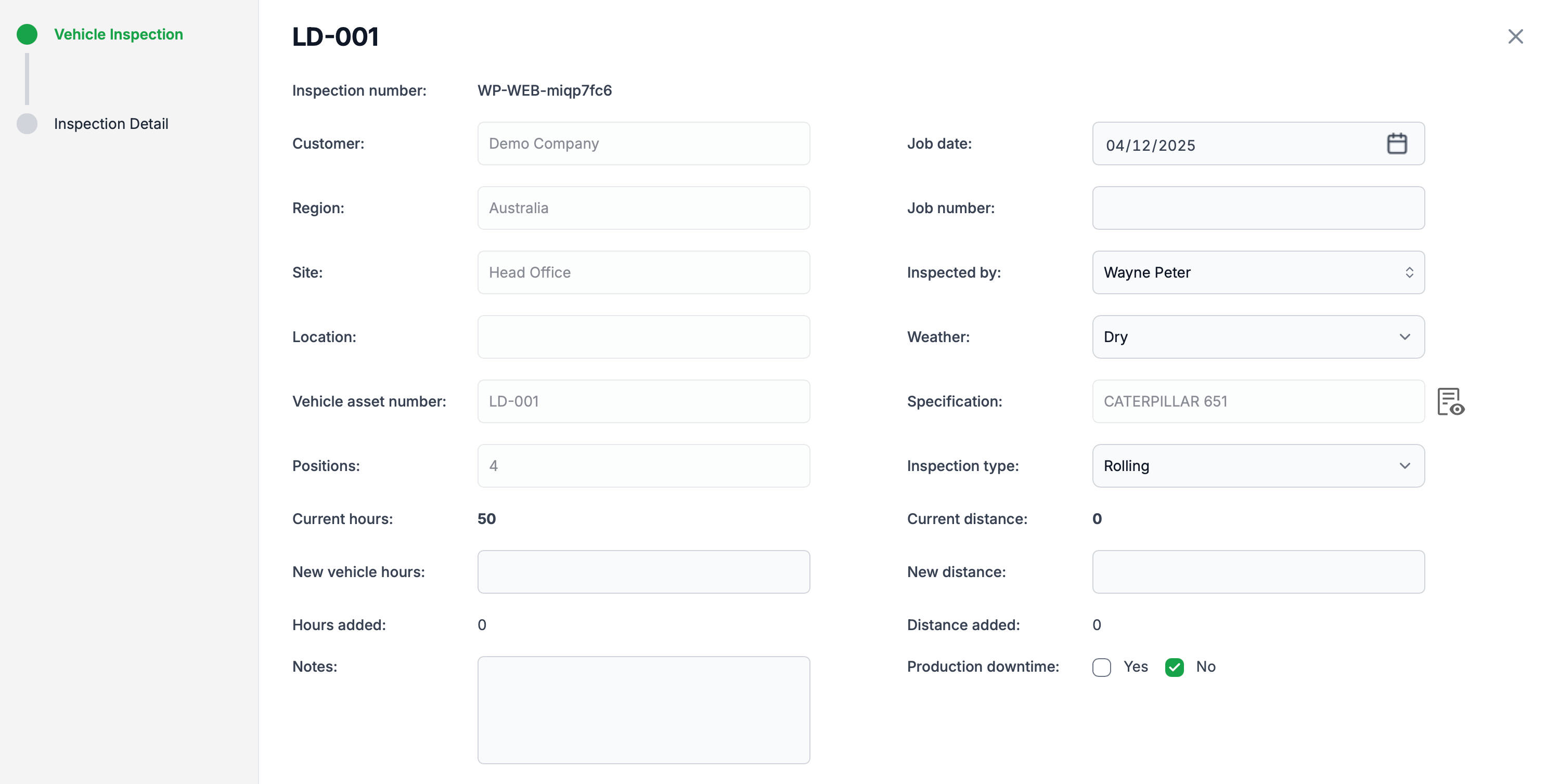 After clicking the inspection icon the 'Vehicle Inspection' dialogue will be displayed. By default the customer, region and site information as well as the current vehicle details will be displayed. From the 'Inspected by' dropdown, select a single or multiple users who carried out the inspection.