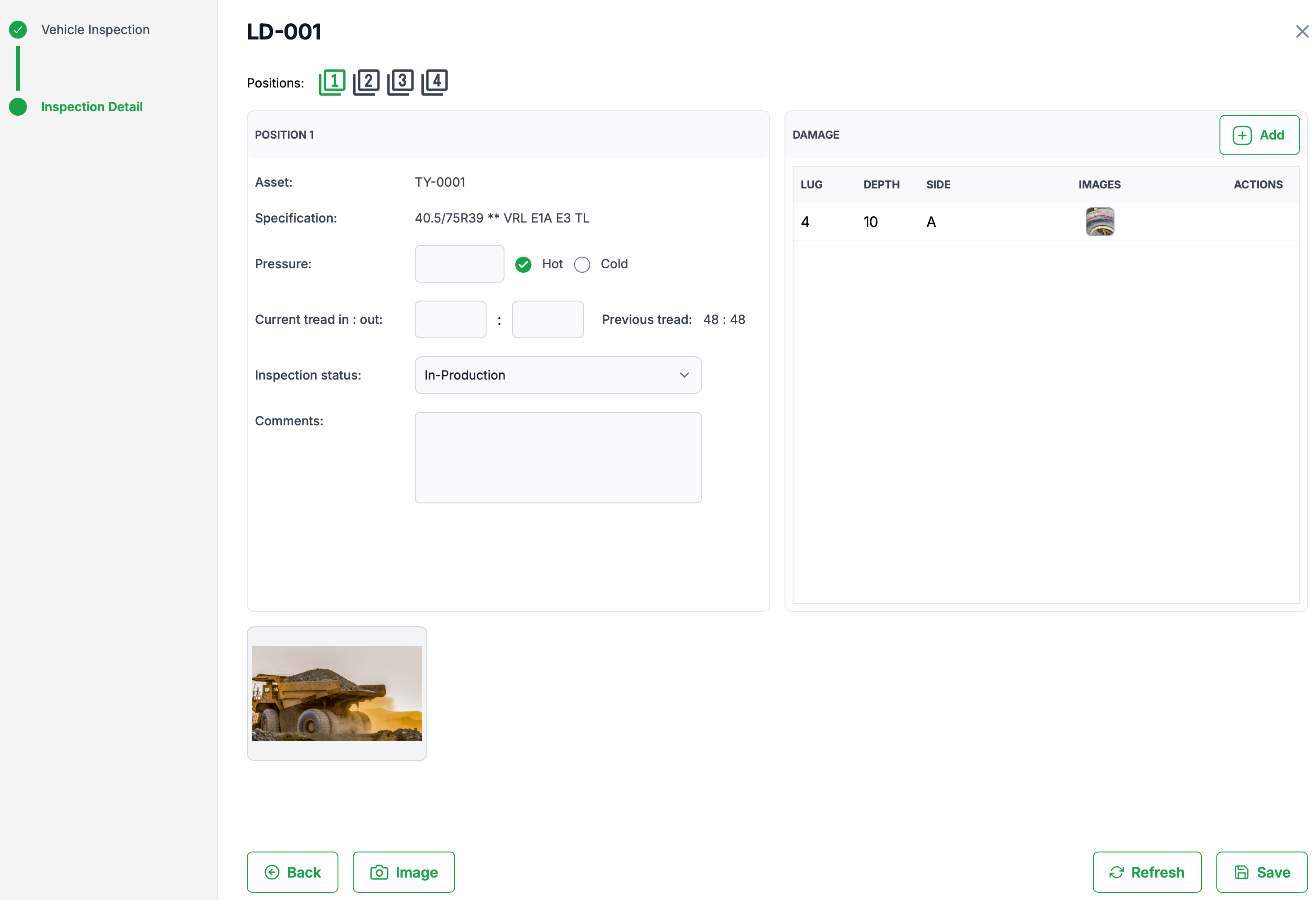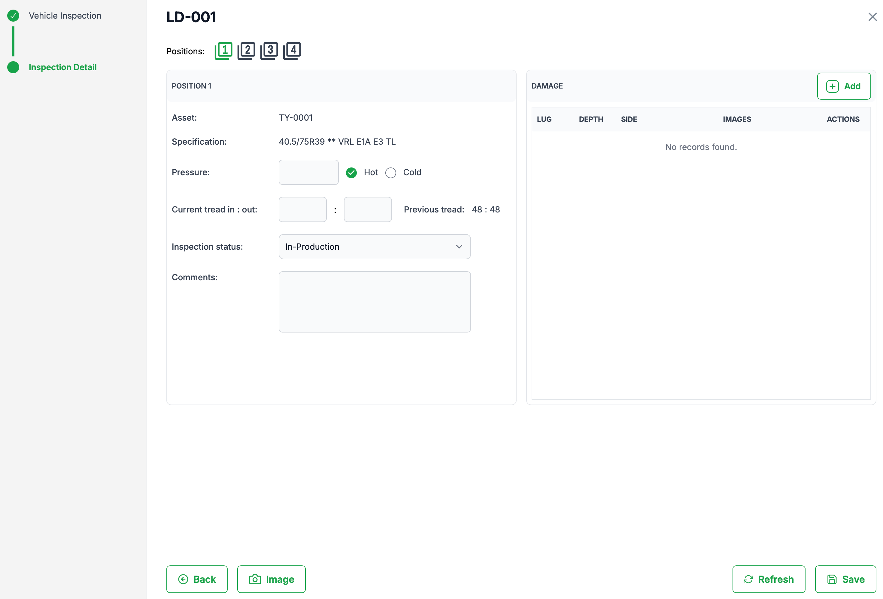 | NOTE: By pressing save without adding any tyre information will save the inspection. This is helpful when only a visual inspection is required and no damage needs to be recorded. |