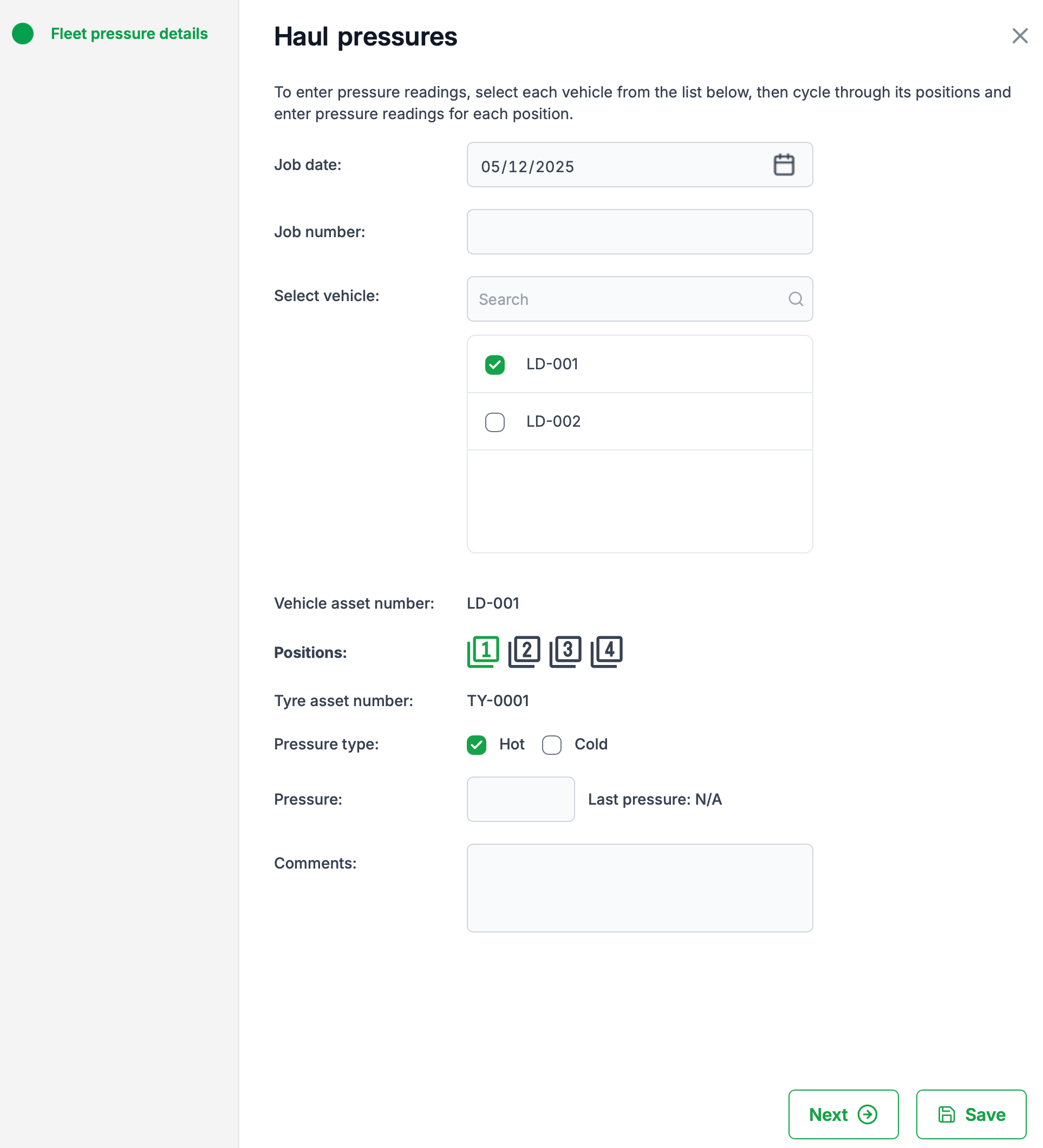 By following these steps, you can efficiently record accurate tyre pressures for multiple vehicles from one streamlined interface.