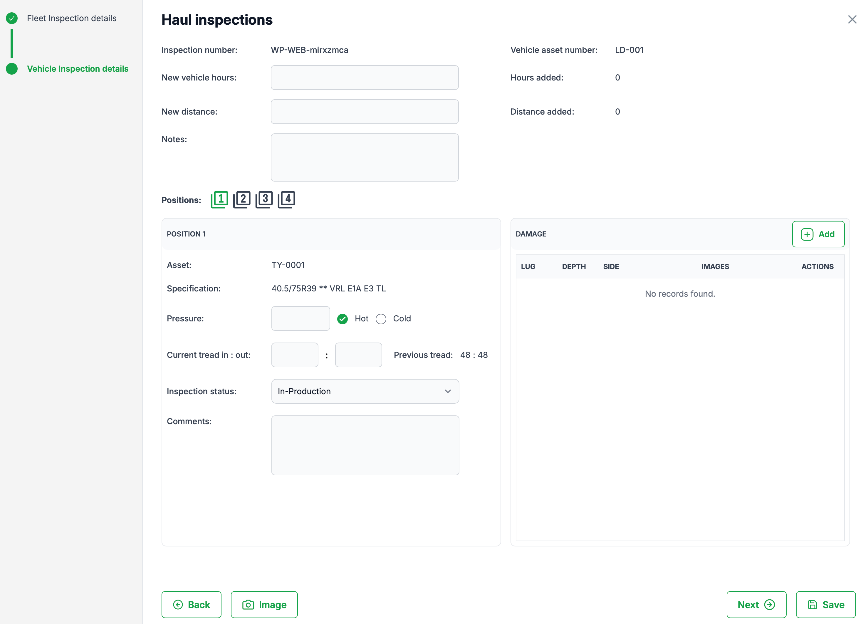 Record hours, distance, pressure, tread depths, inspection status, damage, comments and images
