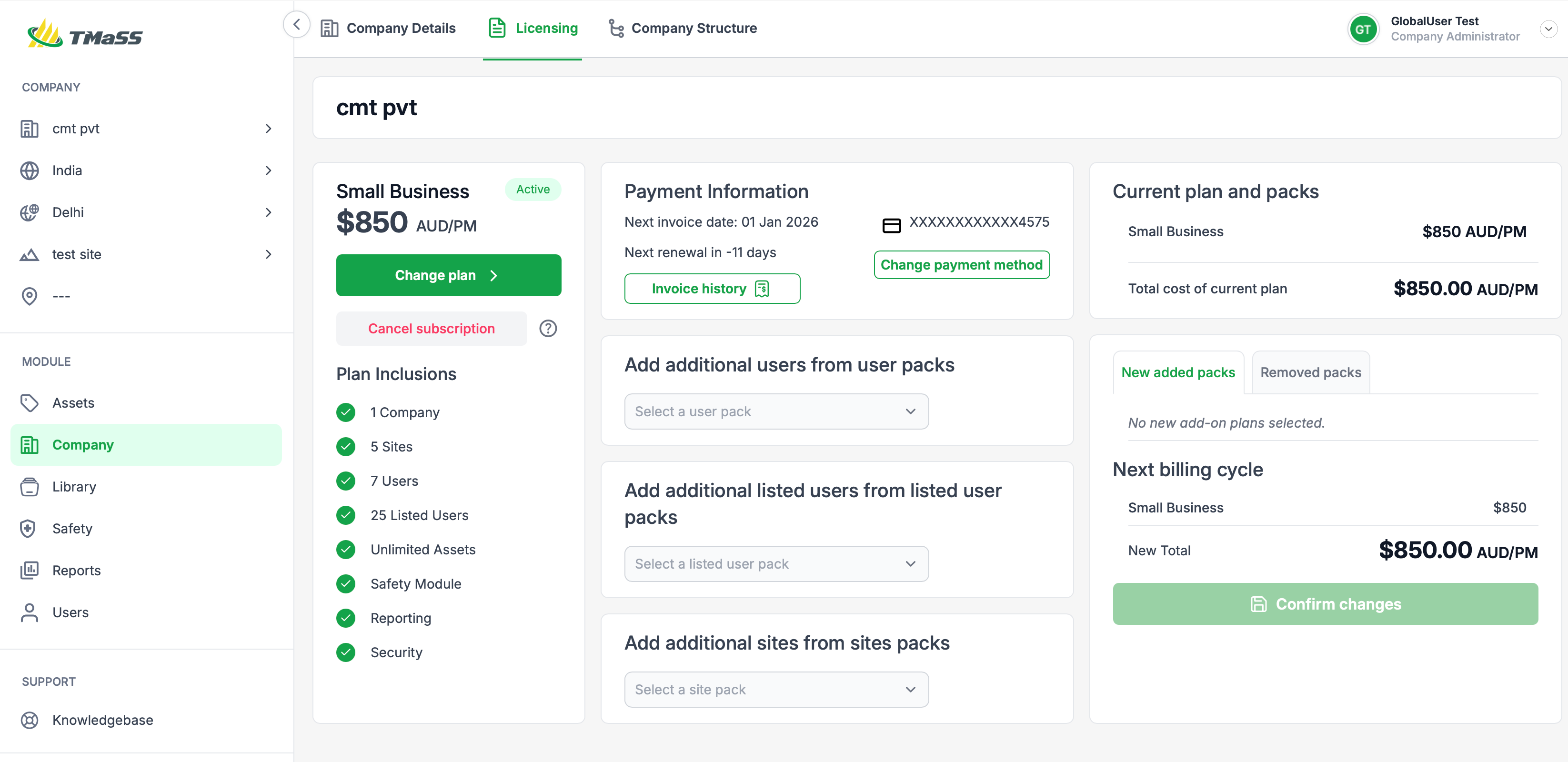 The Licensing sub-module is where company and licensing administrators manage your TMaSS subscription, plans and billing.