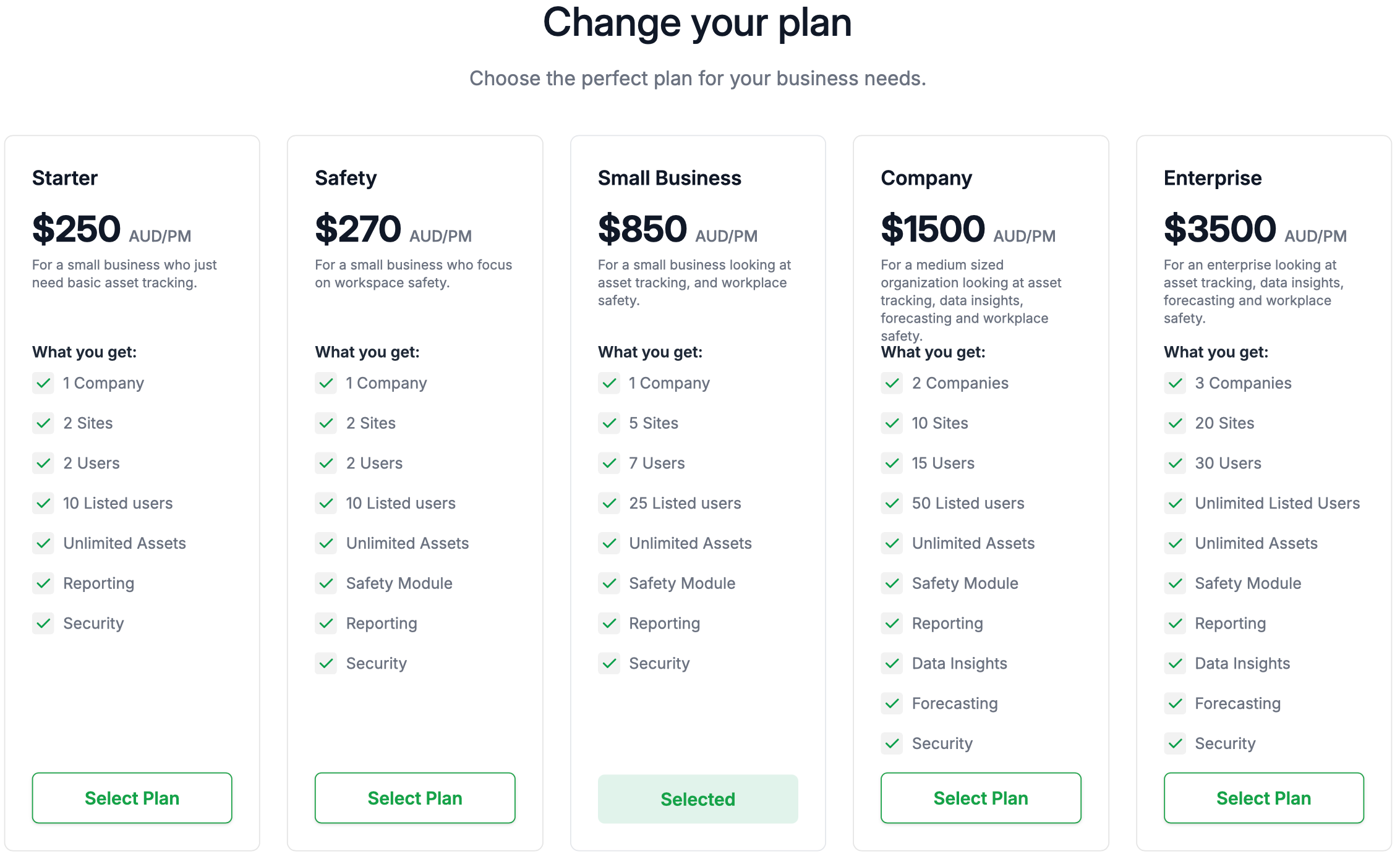 Plan name and price – e.g. Small Business – $850 AUD/PM.