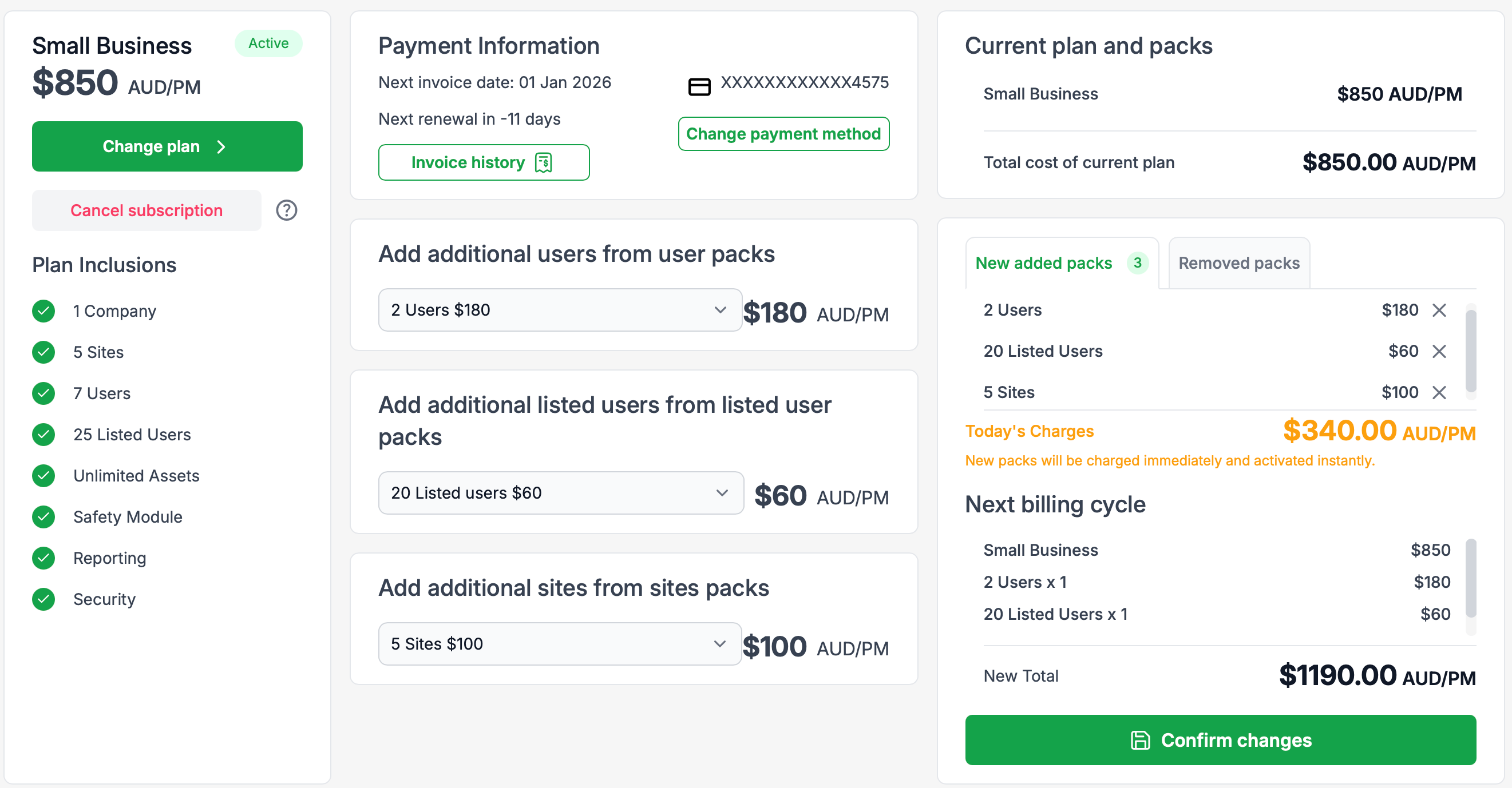 Next billing cycle shows the updated monthly total for the next invoice.
