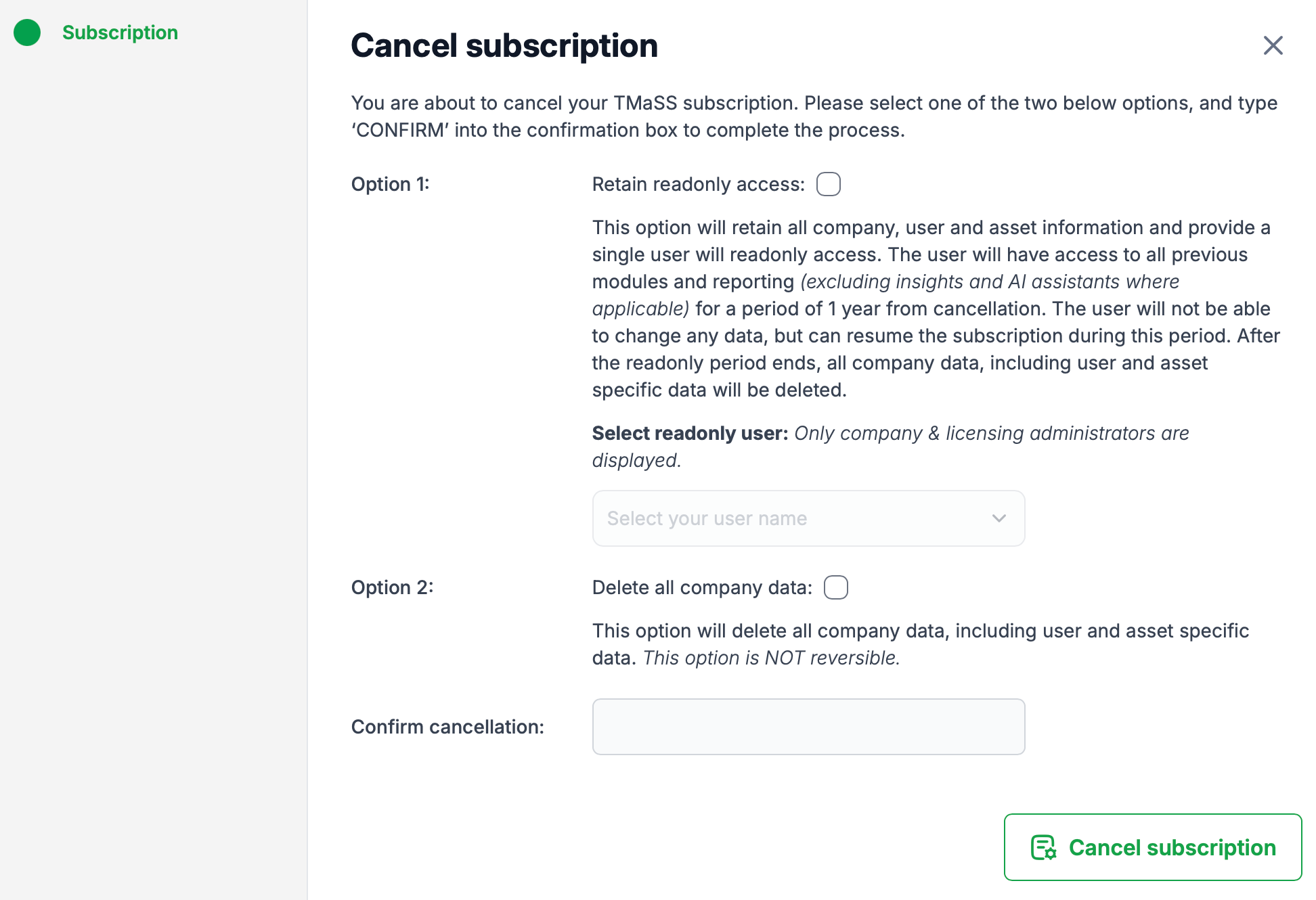 Select Retain readonly access if you want to keep your data for reference and have the option to resume your subscription later.