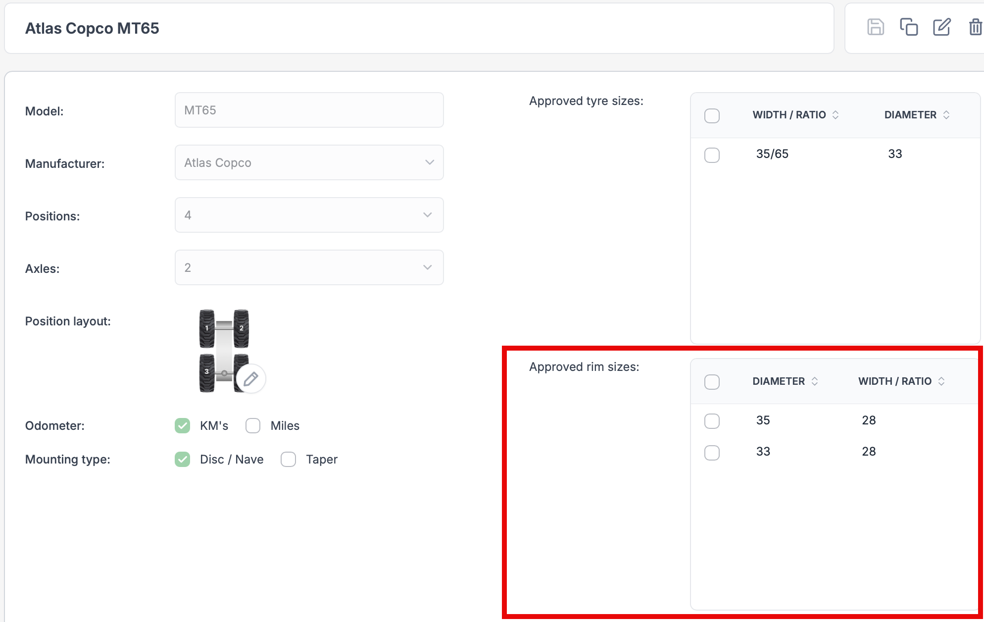 As shown in Image 1 below, the vehicle specification contains an Approved rim sizes section. If the rim size of the new rim asset is not listed there, TMaSS will not make that rim available for selection when assigning rims to positions through Manage Positions.