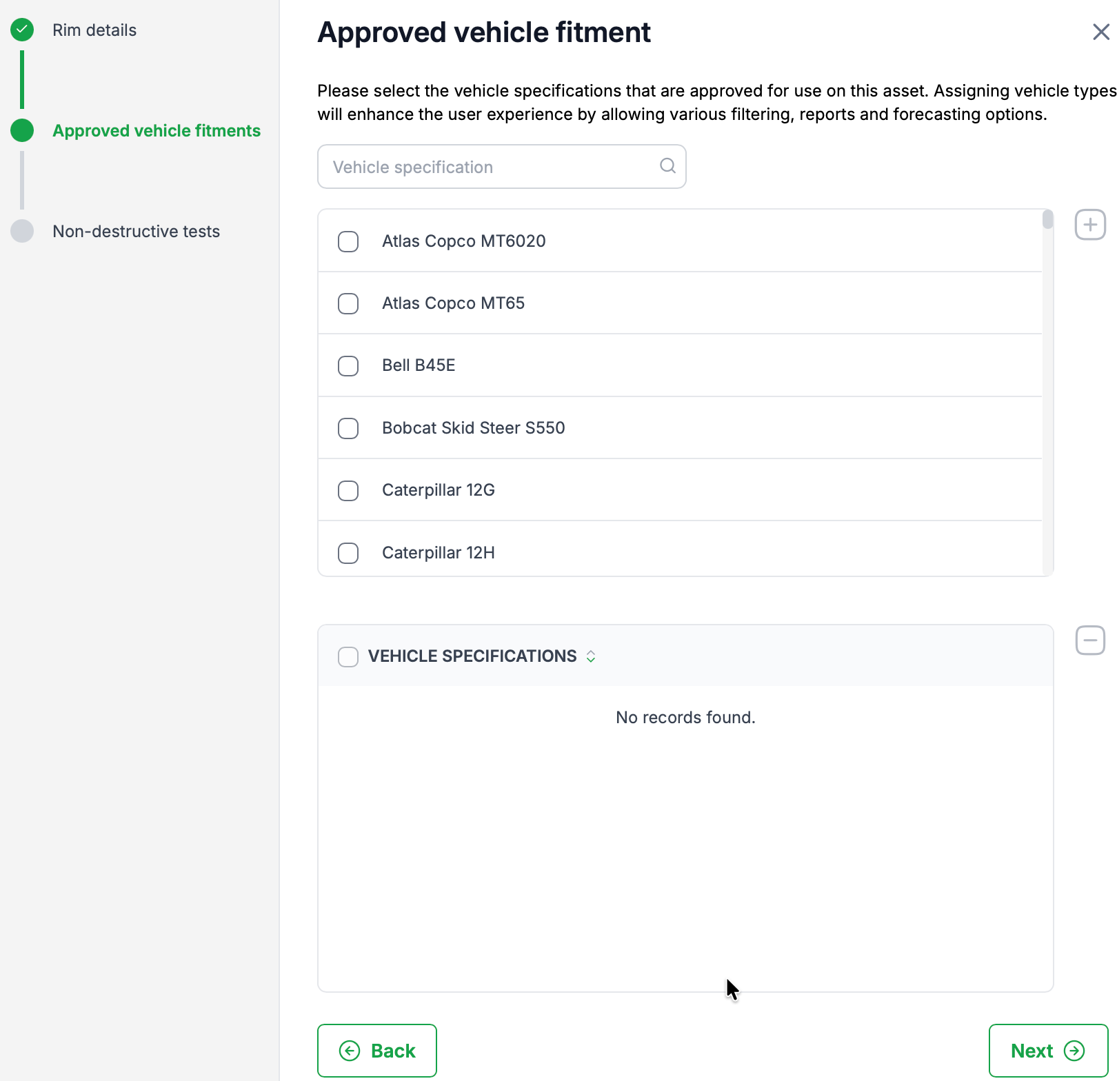 - On step 2 of the rim creation wizard, select the relevant vehicle specification(s) that are approved to use that rim.