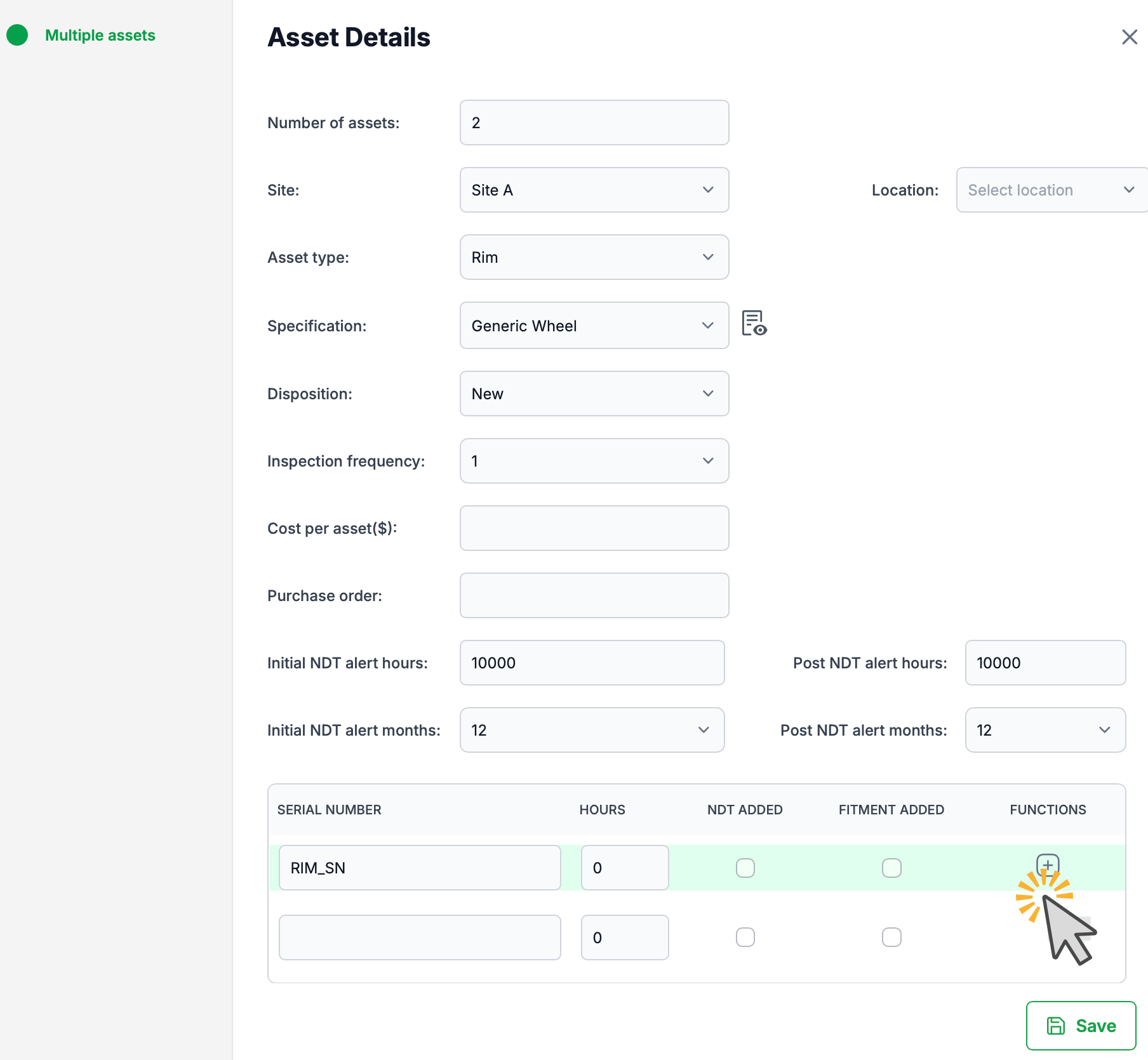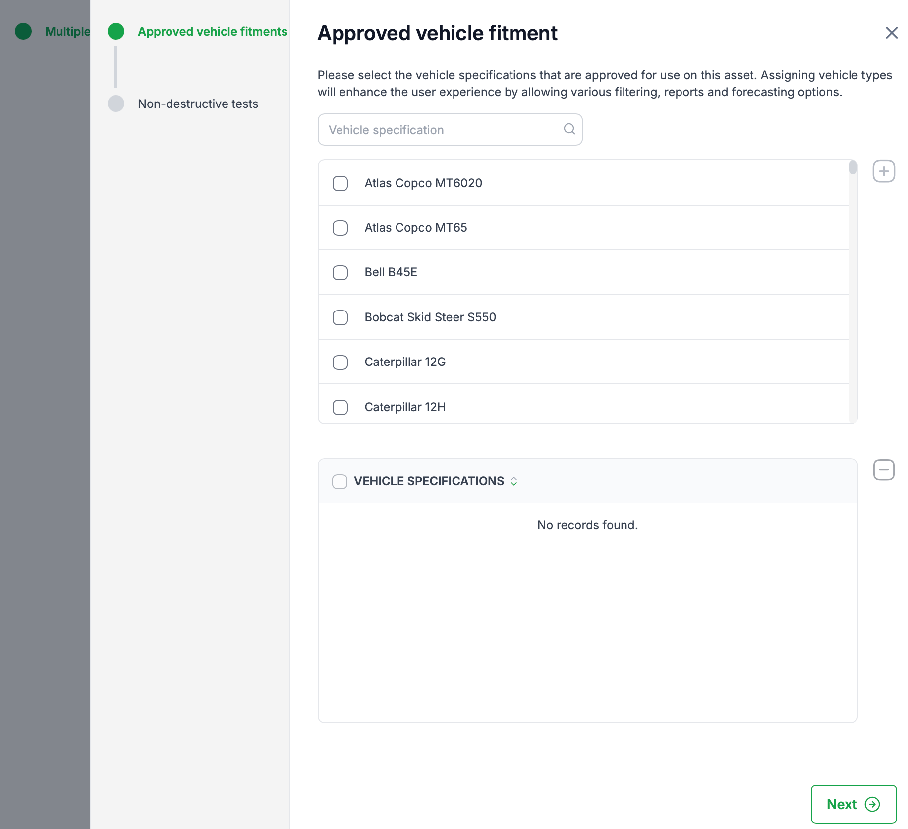 When using the 'Add Multiple assets' function to create rims, the Approved vehicle fitment step is associated with the serial number, as shown in image 3 below. Pressing the '+' icon, the 'Approved fitments' dialogue is displayed (image 4) allowing the user to nominate which vehicle specifications are approved to use that rim specification.
